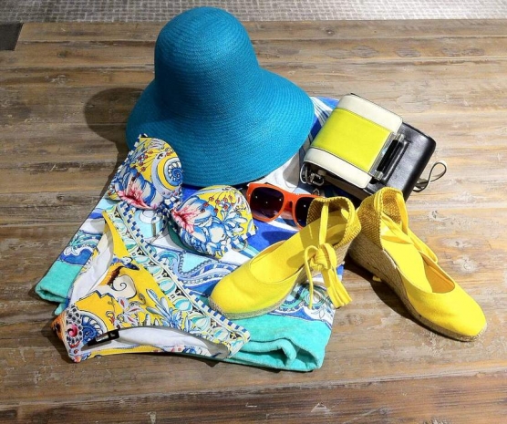 Море, солнце – все это в цветах комплекта для пляжа: купальник от Roberto Cavalli, шляпка Borsalino, сумочка дизайнера Diane von Furstenberg, очки Linda Farrew, летние легкие туфли от Castaner, ну и полотенце от Emilio Pucci, без которого на пляже не обойтись.