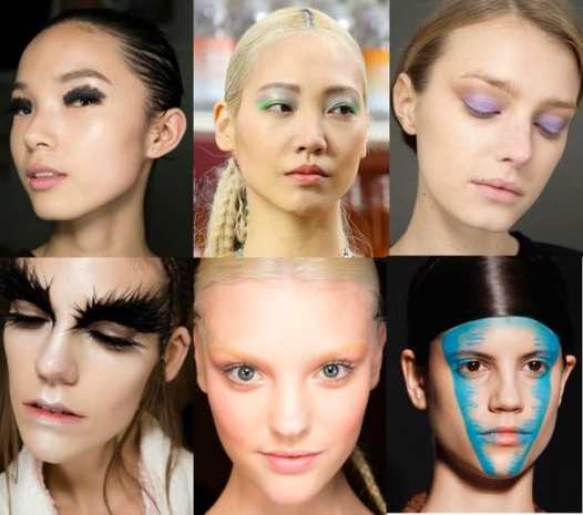 Яркий макияж глаз в бронзово-золотистой гамме, подчеркнуто верхнее веко серой подводкой. Все лицо и губы покрыли серебристым напылением, создав ощущение, что модели только вернулись с мороза. Искусственные брови и ресницы на некоторых моделях добавили их образу мистичности. Волосы девушек были заплетены в тонкие косы, опоясывающие голову.