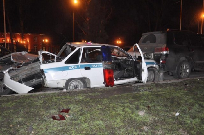 ДТП произошло на проспекте Аль-Фараби, в западном направлении, между Ремизовкой и улицей Водозаборной. Полицейские приехали на ДТП, в котором водитель автомашины KIA сзади на полном ходу врезался в Lexus. Полицейские приступили к оформлению аварии и поставили автомашину у обочины прямиком за автомашиной Lexus. Водитель автомашины Mercedes двигался по Аль-Фараби на высокой скорости, не справился с управлением, вылетел на обочину и на скорости врезался в полицейское авто, которое откинуло прямиком в Lexus.