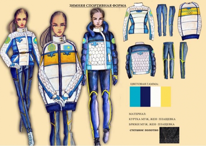 Жесткий отбор прошли два казахстанских и один китайский дом моды. Они разработали весь комплект одежды. А это около 30 атрибутов, начиная от нижнего белья, заканчивая верхней одеждой и обувью. К слову, на экипировке в этом году власти решили не экономить. Всего будет пошито около 150 комплектов, стоимость каждого – до пяти тысяч долларов. Напомним, на пошив одной спортивной экипировки на Олимпиаду в Ванкувере Казахстан выделял меньше средств – порядка 370 тысяч тенге.