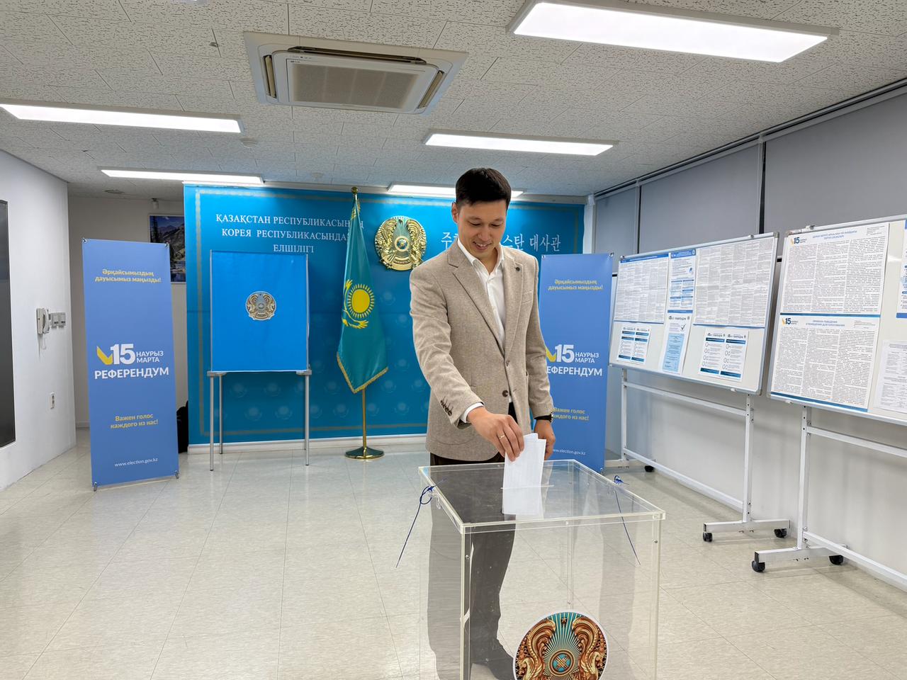Одним из первых на участке в Сеуле проголосовал гражданин Казахстана Ернар Сарсенбаев, сотрудник Азиатской организации по сотрудничеству в области лесного хозяйства (AFoCO).