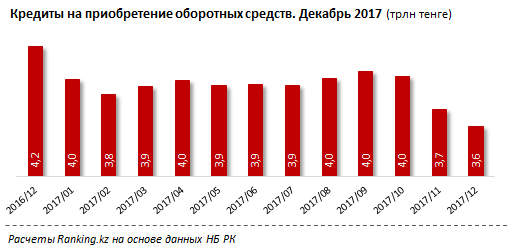 Негативный тренд в сегменте ссуд на приобретение оборотных средств был зафиксирован уже в начале 2017 года. Так, снижение кредитных объемов в январе составило 6,2% (260,3 млрд), до 4 млрд тг, в феврале - еще 3% (120,7 млрд тг), до 3,8 трлн тг.