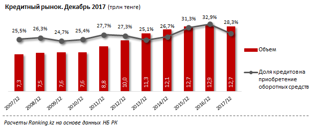 Кредитный рынок БВУ РК в 2017 году после нескольких лет непрерывного роста просел на 1,2% (153,8 млрд), до 12,7 трлн тг, отмечает Ranking.kz.