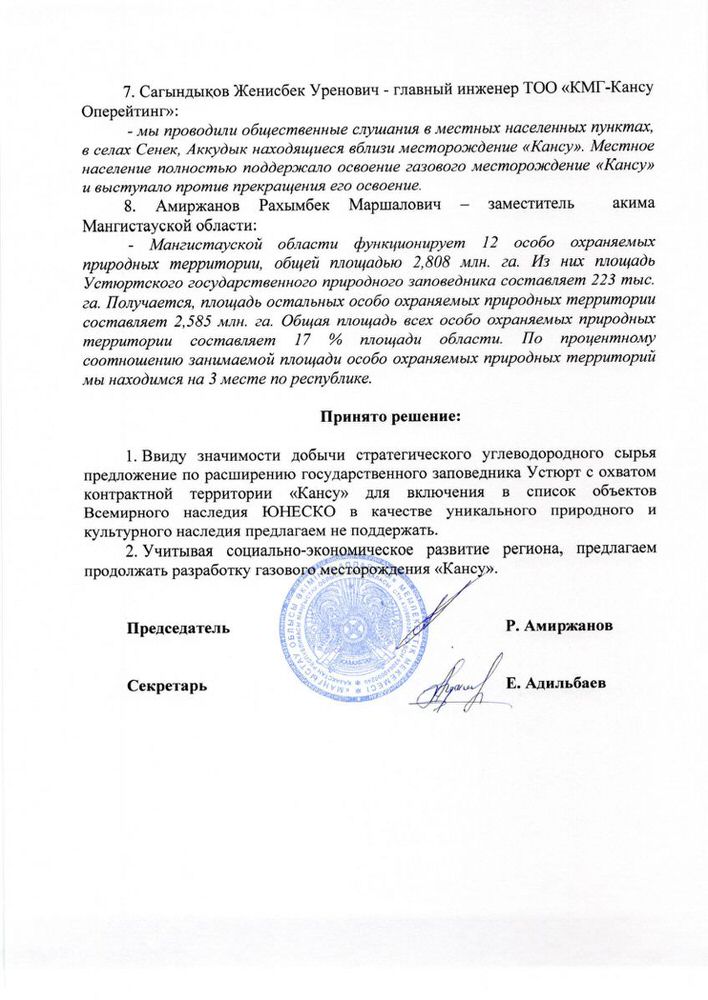 «Что может быть лучшей рекламой как не внесение территории в мировой список наиболее интересных мест мира? Этот список продвигает ООН, для многих туристов он является руководством при выборе цели путешествия. Многие хотели бы увидеть в нем объекты своей страны. Многие, но как оказывается не все! Акимату Мангистауской области это не нужно! «У нас и так много охраняемых территорий и расширять их нужды нет!» – сказано было на заседании комиссии. Уж лучше добыть еще немножечко газа. Следует отметить, что потенциальных мест, где можно добывать газ, в Мангистауской области немало. Но эти места еще не достаточно изучены. А вот участок Кансу, частично расположенный на территории двух особо охраняемых территорий – Кендерли-Каясанской государственной заповедной зоны и Устюртского заповедника, уже изучили! Кстати о том, что это действительно так, что участок затрагивает особо охраняемые природные территории, сказано в официальном документе, фиксирующем еще одно «мудрое» решение – Заключение государственной экологической экспертизы на проведение сейсморазведочных работ, которое выдал департамент экологии по Мангистауской области. По истине диву даешься мудрости и согласованности решений наших государственных органов!», – резюмировала Светлана Могилюк.
