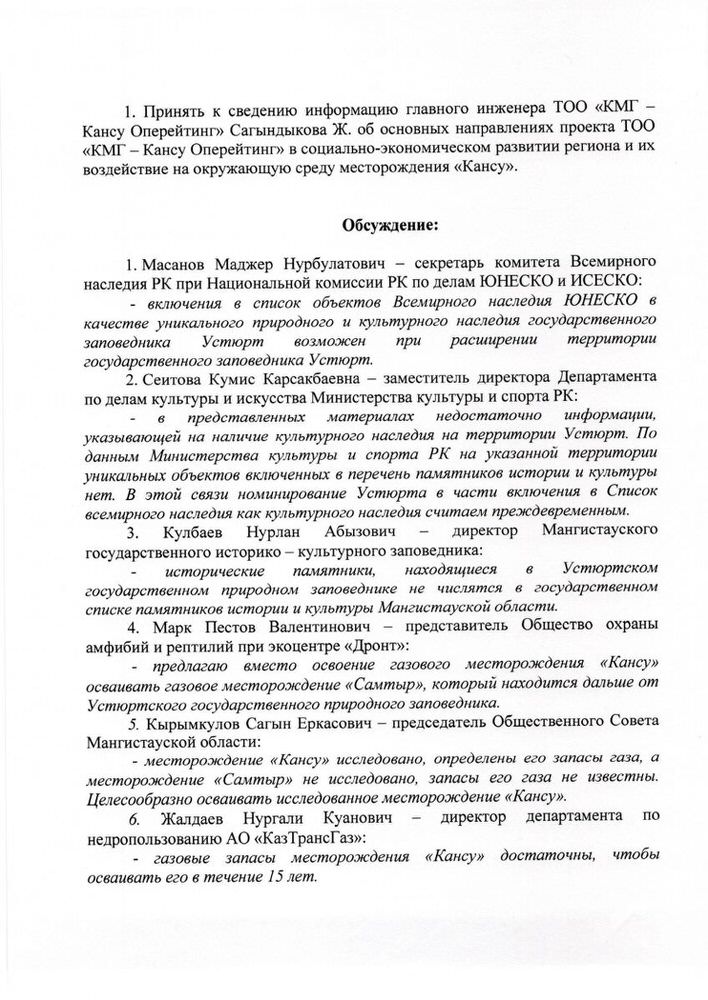 Из протокола выездного совещания по рассмотрению выдвижения для включения в список объектов Всемирного наследия ЮНЕСКО в качестве уникального природного и культурного наследия государственного заповедника Устюрт (г. Актау, №09-05/142 от 14 сентября 2016 г.)
