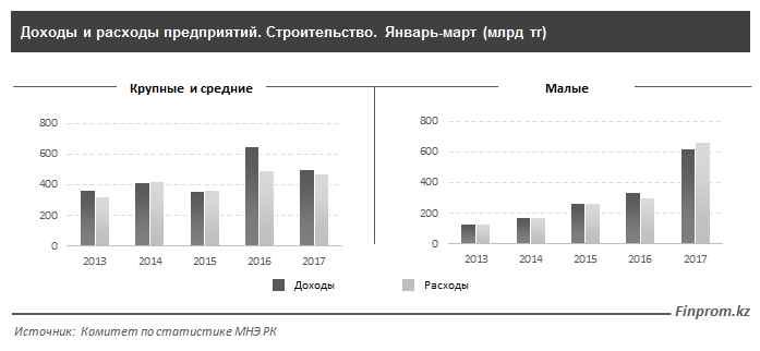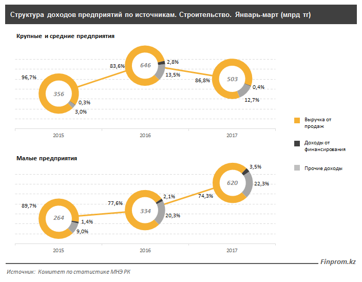 За январь-март текущего года доходы от реализации продукции и оказанных услуг в малом секторе выросли на 201,2 миллиарда тенге, или на 77,5%. У крупных и средних стройкомпаний выручка от продаж за год упала на 103,2 миллиарда тенге, или на 19,1%.