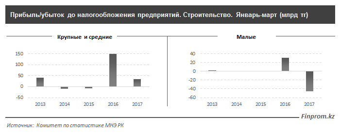 Это значительно хуже итогов деятельности стройкомпаний в январе-марте прошлого года, когда была получена совокупная прибыль (до налогообложения) в 180,8 миллиарда тенге.