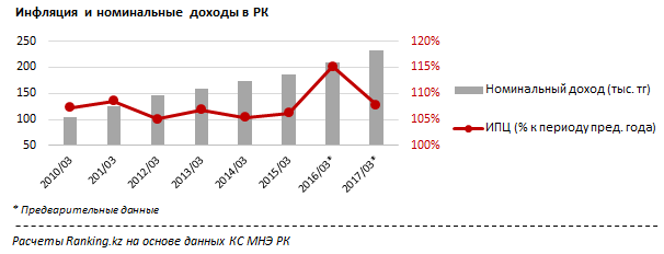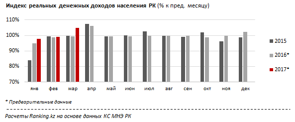 В текущем году доходам казахстанцев удалось опередить в росте инфляцию. Номинальные денежные доходы за январь-март 2017 года составили 232,1 тысячи тенге, или на 10,4% больше, чем было годом ранее. За этот же период потребительские цены на товары и услуги в РК выросли на 7,8% – инфляционное давление в этом году значительно ниже, чем в прошлом году. Таким образом, уровень жизни в РК возвращается к состоянию 2013-2014 годов, когда потребительская активность в стране росла, а бизнес-климат в экономике был достаточно благоприятным.