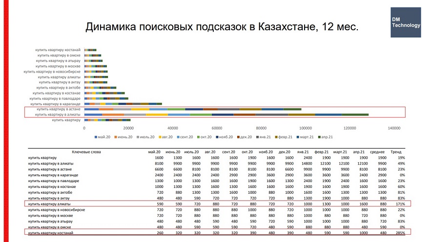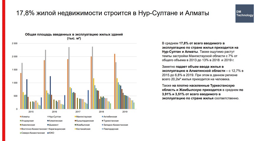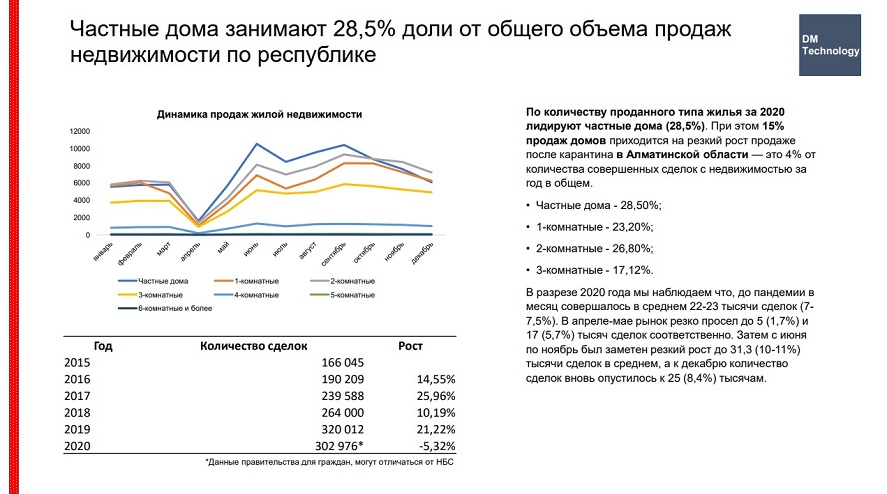 «Посмотрев на динамику проданного жилья за прошлый год, можно понять, что это не процесс накачки «пузыря». Чаще всего люди покупают частные дома, потому что половина страны — это большие сельские семьи. А в городах самое популярное жилье — это одно-двухкомнатные квартиры, которые покупают молодые семьи. К сожалению, для многих эти небольшие квартиры так и остаются единственным жильем. Поисковые запросы показывают, что люди с каждым годом все чаще вбивают в строку поиска запросы о недвижимости. На первом месте — квартиры в Алматы, на втором — в Нур-Султане, и, неожиданно, в этом году наблюдается рост интереса к квартирам в Костанае. В остальных регионах ищут преимущественно дома», — констатирует эксперт.