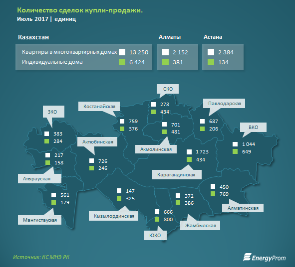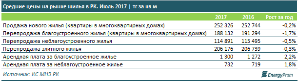 Цены на жилье в сравнении с прошлогодними снизились практически по всем сегментам рынка, однако сильнее всего - на вторичное жилье (сразу минус 1,7% за год, до 188,1 тыс. тг за кв м по итогам июля). Для сравнения, стоимость «квадрата» в новостройках снизилась всего на 0,2% год к году, до 252,3 тыс. тг.