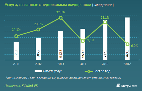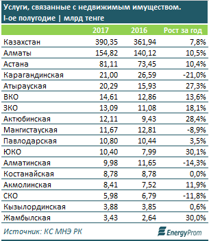 За I полугодие объем услуг, связанных с недвижимым имуществом, достиг 390,35 млрд тг - на 7,8% больше, чем в аналогичном периоде прошлого года, сообщает Energyprom.