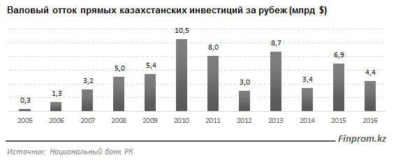 Вера казахстанских инвесторов в отечественную экономику окрепла – валовый отток прямых инвестиций от казахстанских инвесторов за рубеж в 2016 году сократился на 37%, или на $2,5 миллиарда, пишет Finprom в своем обзоре.