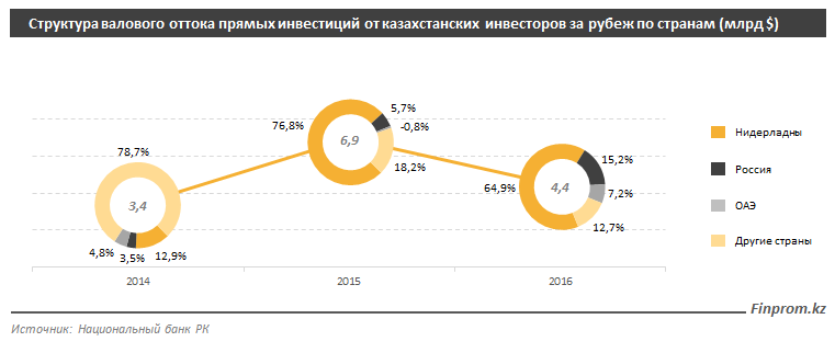 Наибольшее замедление было зафиксировано по вложениям казахстанских инвесторов в головные компании и предприятия, занимающиеся вопросами управления. В 2016 году в такие организации было вложено всего $2,4 миллиарда против $5,3 миллиарда годом ранее.