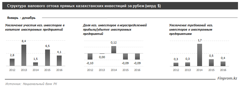 За 2016 год прирост участия казахстанских инвесторов в капитале иностранных компаний уменьшился на 36%, до $4,1 миллиарда. Объем долговых обязательств иностранных предприятий, находящихся в собственности, вырос всего на $361 миллион, что на 33% меньше уровня 2015 года.