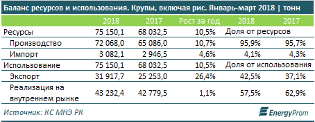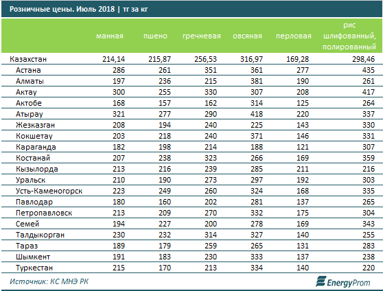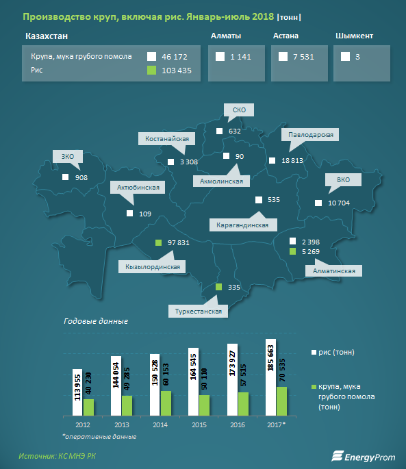 Основные производители круп - Павлодарская область (40,7% от РК), ВКО (23,2%) и Астана (16,3%).