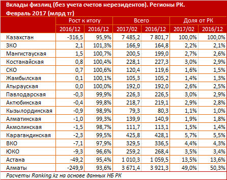 В региональном разрезе только пять областей показали прирост депозитов физлиц за январь-февраль 2017 года. Лидирует ЗКО, прирост за два месяца составил 2,1 млрд тенге, до 166,9 млрд тенге, доля области увеличилась с 2,1% до 2,2%. На втором месте находится Мангистауская область с приростом с начала года 1,5 млрд тенге. Объем вкладов населения в области составил 200,5 млрд тенге, доля от РК выросла с 2,6% до 2,7%. Замыкает тройку лидеров Костанайская область, прирост депозитов физлиц за два месяца составил 0,8 млрд тенге, до 228,1 млрд, доля на конец февраля составила 3%, на начало года было – 2,9%.