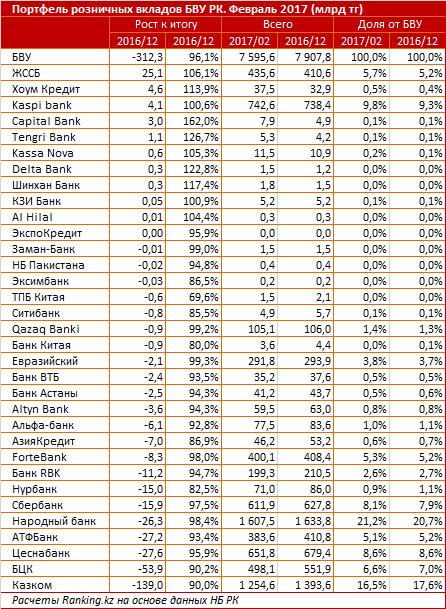 С начала 2017 года вклады населения в национальной валюте увеличились на 4%, с 2,99 трлн до 3,11 трлн тг. Валютные депозиты за тот же период сократились на 9%, до 4,48 трлн тг. В результате доля тенговых вкладов на рынке выросла до 41% против 38% в начале года. В целом объем розничного депозитного портфеля сократился за два месяца на 4,0% до 7,59 трлн тг.