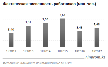 На конец 1-го квартала текущего года фактическая численность работников в РК составляла 3,5 миллиона человек. Это на 1%, или на 44 тысячи человек, больше, чем было в январе-марте прошлого года.