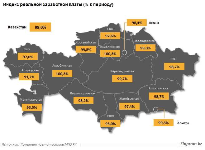 Самое большое сокращение реальной стоимости зарплат было зафиксировано в нефтяных регионах: в Атырауской области уровень сокращения составил 8,3%, в Мангистауской области – 6,5%.