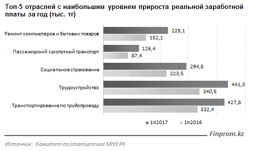В структуре экономики наибольший прирост реальных зарплат показали оклады работников, занимающихся ремонтом компьютеров и бытовой техники – по сравнению с январем-мартом 2016 года они выросли сразу на 39,7%, их среднемесячная номинальная зарплата в течение 1-го квартала текущего года составляла 229 тысяч тенге.