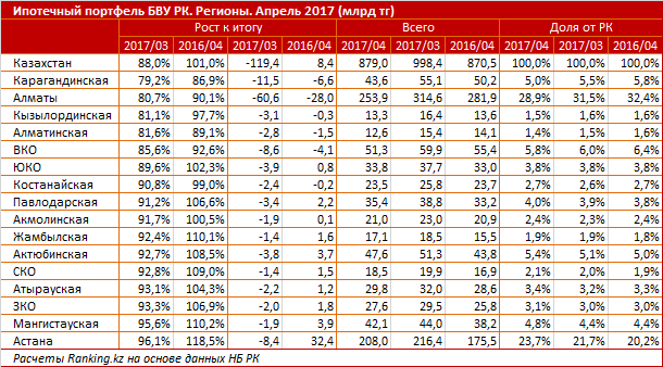 В разрезе регионов сокращение ипотечного портфеля в апреле 2017 года было зафиксировано по всему Казахстану.