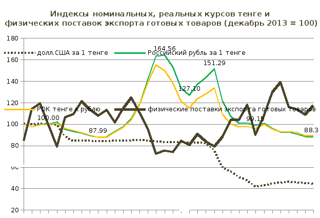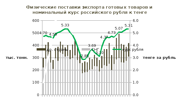 Проведенное в ходе исследования сопоставление объемов экспорта готовых товаров и номинального курса казахстанского тенге к российскому рублю показывает, что падение объемов экспорта происходило в периоды фактической фиксации номинального курса тенге к доллару на фоне девальвации российского рубля. Зависимость экспорта обработанных товаров от курса тенге к рублю наблюдается по основной линейке продуктов. Сохранение паритета тенге к рублю позволило увеличить конкурентоспособность отечественных товаров на внешних рынках, восстановить и увеличить физические объемы экспортных поставок, что наблюдаются со второй половины 2015 года, констатирует К. Кожамкулов.