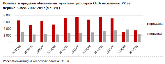 В этом году всего в 6 регионах РК из 16 был зафиксирован рост объемов покупок населением долларов США в обменных пунктах. За январь-май 2017 года сильнее всего спрос на наличную валюту вырос в Мангистауской области - объем покупок увеличился на 54,3%, или на $65,5 млн.