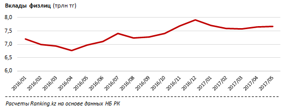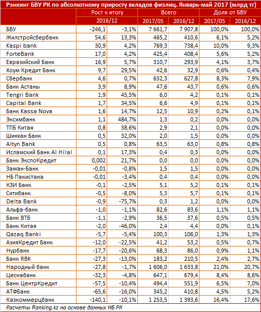 Замыкает топ-3 Fortebank - за январь-май текущего года вклады физлиц в банке увеличились на 17 млрд тенге, или на 4%. Доля банка на рынке выросла до 5,6% с 5,2% в начале года.