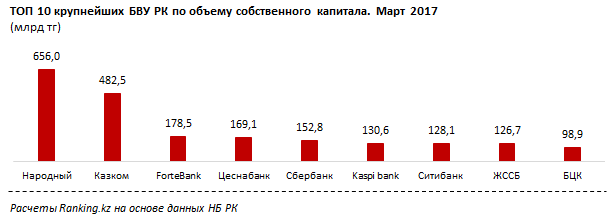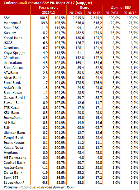 Лидером по увеличению объема собственного капитала за январь-март 2017 года стал Народный банк, прирост составил 39,8 млрд (6,5%) до 656,0 млрд тенге. Доля от БВУ РК выросла с 21,7% до 22,3%.