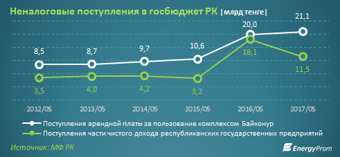 Тем не менее по сравнению с отчетным периодом прошлого года неналоговые поступления сократились на 20%. Причиной стало сокращение поступлений в республиканский бюджет, отмечает Energyprom. Если в прошлом году за отчетный период поступления составили 150 млрд тенге, то в этом году лишь 74 млрд тенге.