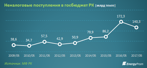Неналоговые доходы бюджета РК за пять месяцев 2017 года составили 140,3 миллиарда тенге, что составило 84 процента годового плана.