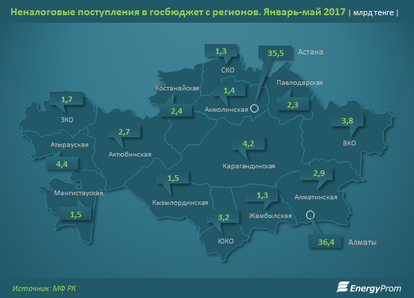 За пять месяцев текущего года почти 70% неналоговых доходов страны пришло от Алматы и Астаны - 36,4 млрд тенге и 35,5 млрд тенге соответственно. При этом поступления от Алматы увеличились почти в 7 раз к аналогичному периоду прошлого года. Чего нельзя сказать про столицу - неналоговый сбор сократился на 70%.