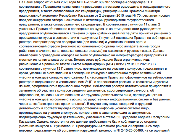 В-третьих, Бауыржан Нукибаев пока шел судебный процесс, принимал активное участие в конкурсе на вакантное место директора коммунального государственного предприятия (КГП) «Су» в Аягозском районе. Причем комиссию не смутило, что он не предоставил сведений о трудовой деятельности в соответствии с требованиями отбора. По правилам требуется наличие стажа работы не менее 5 лет по специальности на руководящих должностях в сфере деятельности предприятия.