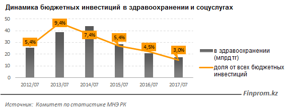 Государство в Казахстане все больше дистанцируется от оказания инвестиционной поддержки системы здравоохранения и социальных услуг. За 7 месяцев текущего года в основной капитал учреждений здравоохранения инвестировано всего 17,5 миллиарда тенге бюджетных средств.