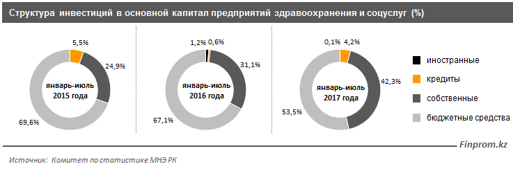 Чтобы компенсировать нехватку бюджетных ресурсов, организациям здравоохранения пришлось увеличить инвестирование в свое развитие собственных средств. Всего за январь-июль текущего года в отрасль было вложено 32,7 миллиарда тенге инвестиций, из которых 13,8 миллиарда тенге (или 42,3%) были собственными.