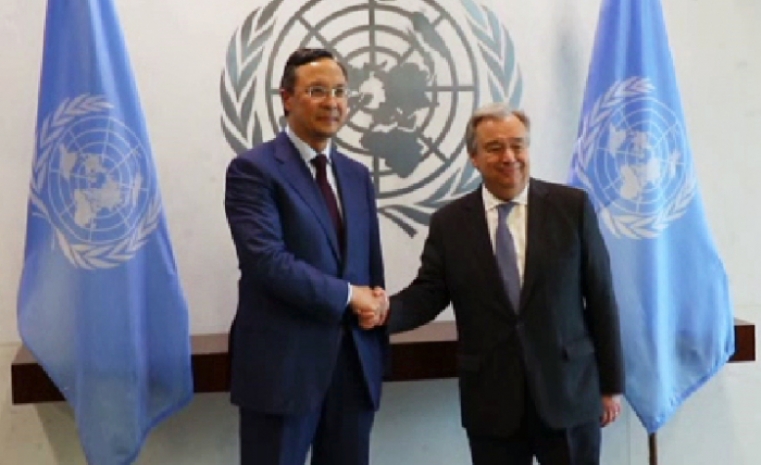 В рамках пребывания в Нью-Йорке глава казахстанского МИД провел встречу с генеральным секретарем ООН Антониу Гутерришем. Обсуждалась ситуация в сфере международной безопасности. В частности, министр проинформировал генсекретаря о ходе Астанинского переговорного процесса по Сирии.