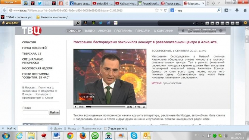 Сегодня утром с сайта российского телеканала ТВЦ пропала запись сюжета о беспорядках в Алматы, в котором в качестве главного действующего лица был назван певцом Ахметжан Есимов, сообщает корреспондент Total.kz.