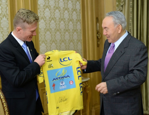 В ходе встречи Винокуров вручил главе государства майку велокоманды «Астана», победившей в шоссейной многодневной велогонке «Тур де Франс» в прошлом году.