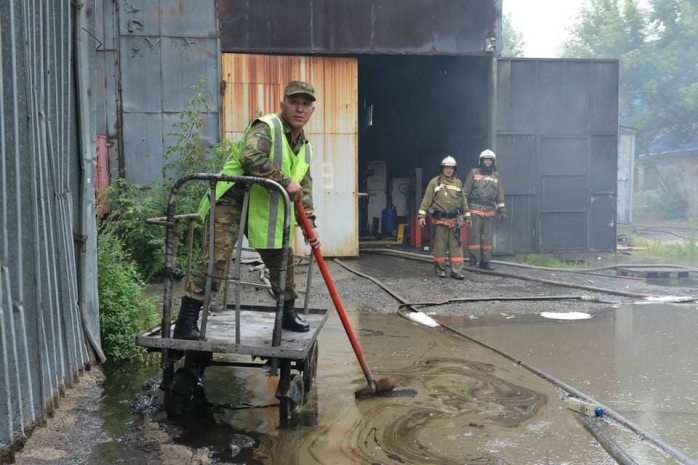 По словам оцевидцев, сначала в районе пожара запахло жженой резиной, а затем на территории склада внезапно поднялся столб огня из дыма. Взрыва при этом никто не слышал. Жители района говорят, что на складе хранилось автомобильное масло.