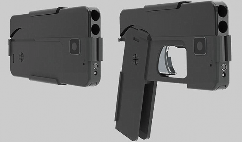 На первый взгляд пистолет ничем не отличается от смартфона: тонкий, черный, стильный, легко помещается в кармане. При нажатии кнопки открываются стволы, и гаджет становится опасным оружием.