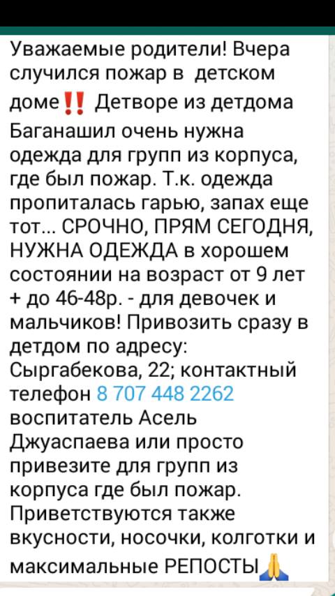 «Мне пришла рассылка по Вотцап о том, что в Алматы произошел пожар в детском доме и просят помощи для детей в виде вещей-одежды, может быть у кого-нибудь есть контакты групп волонтеров, которые занимаются сбором средств, мы бы хотели помочь, но выезжать в тот район возможности нет. Если у кого есть контакты, напишите в личку!!».