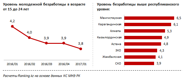 Уровень молодежной безработицы за год сократился с 4,2% до 3,8% на конец I квартала 2017 года, передает Total.kz со ссылкой на ranking.kz.