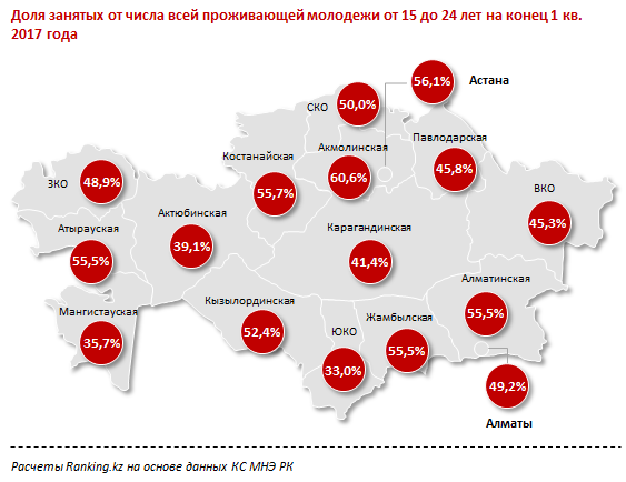 Акмолинская область и Астана предоставляют все же больше шансов для молодых умов. В данных регионах больше половины молодежи трудоустроено или самозанято - 61% и 56% соответственно. Тем не менее уровень молодежной безработицы в столице составляет 4,8%.