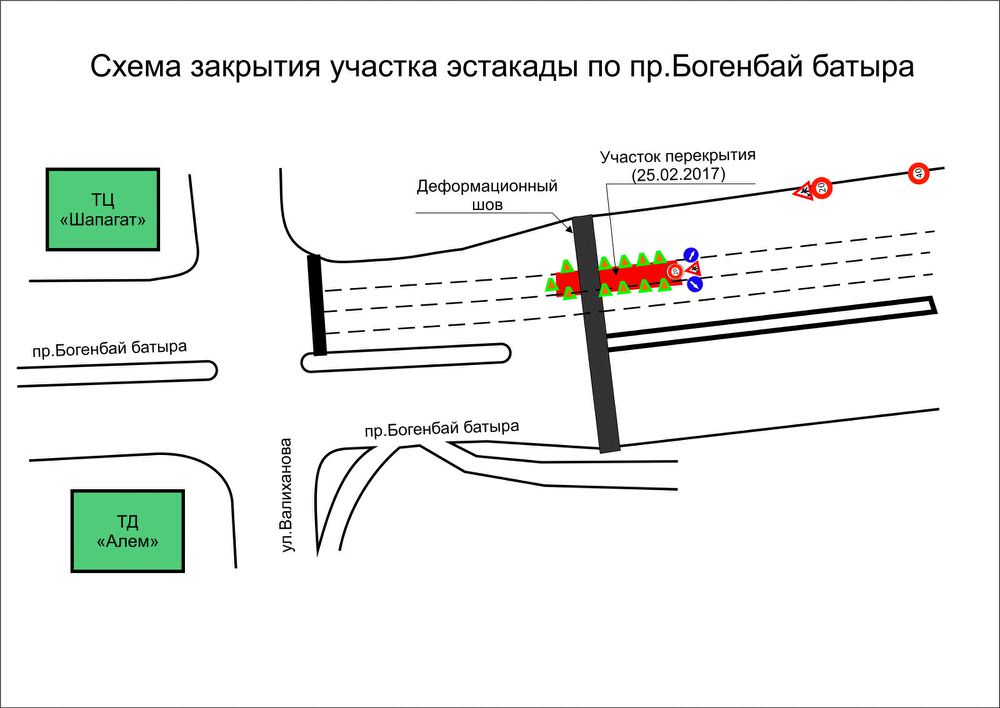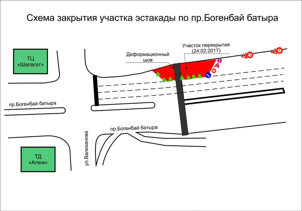 В связи с этим с 24 по 25 февраля будет частично перекрыта проезжая часть эстакады перед улицей Валиханова.