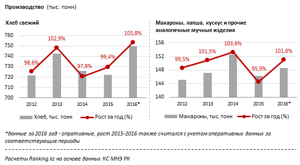 «По итогам 2016 года производство свежего хлеба в РК достигло рекордных 749,7 тыс. тонн, на 3,8% больше, чем в 2015 году, когда отмечался спад. Главной «хлебницей» страны остается ЮКО – доля региона выросла до 23,8% против 20,9% годом ранее, объемы выпуска подскочили на 17,9% до 178,2 тыс. тонн. На этот же регион пришлись и максимальные объемы выпуска кондитерских изделий длительного хранения – 21,2 тыс. тонн, +35,1% к 2015 году (это 22,4% от всего производства подобных изделий по РК)», – сообщает служба по связям с общественностью ranking.kz.