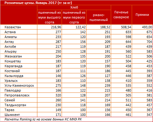 Так, по итогам января текущего года пшеничный хлеб из муки высшего сорта стоил в среднем по РК 217 тг за кг – на 8,6% больше, чем в январе 2016. Хлеб из ржано-пшеничной смеси обходится казахстанцам в среднем в 188,5 тг за кг, на 7,8% дороже, чем годом ранее. Наиболее недорогой хлеб из пшеничной муки первого сорта поднялся в цене заметнее всего – сразу на 17% до 122,4 тг за кг.