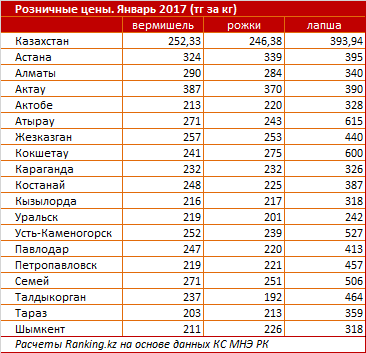 «Больше всего за вермишель отдавали жители Актау – 387 тг за кг, +16,2% за год, как и за рожки – 370 тг за кг, +19,4%. Лапша дороже всего стоила в Атырау – 615 тг за кг, +23% за год. Наиболее доступные цены на вермишель отмечены в Шымкенте – 211 тг за кг, как и годом ранее. Рожки дешевле всего обходились жителям Талдыкоргана – 192 тг за кг, +4,3% за год, лапша жителям Уральска – 242 тг за кг, +1,7% год к году», – заявили в ranking.kz.