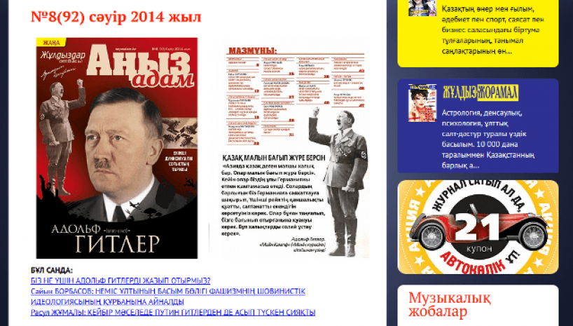 Как сообщалось, казахскоязычный журнал «Аныз Адам» (Легендарный человек) посвятил апрельский номер Адольфу Гитлеру. В нем рассказывается о жизни А.Гитлера, приводятся рассказы его друга Августа Кубичека, а также отрывок из «Майн Кампф». Номер щедро украшен фотографиями Гитлера разных этапов его жизни.