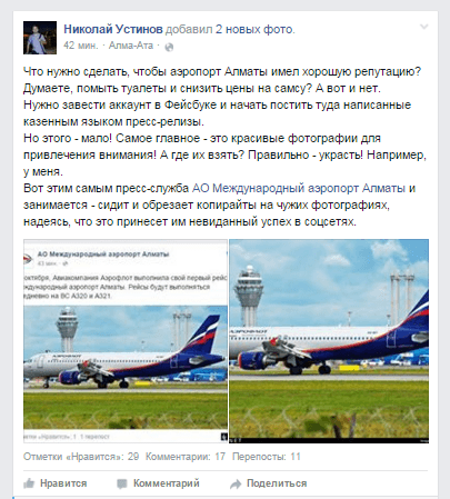 В социальной сети Facebook фотограф опубликовал пост, в котором обвинил Международный аэропорт Алматы (МАА). По его словам, в МАА присвоили авторские фотографии, опубликовав их на своей странице, нарушив закон об интеллектуальной собственности.