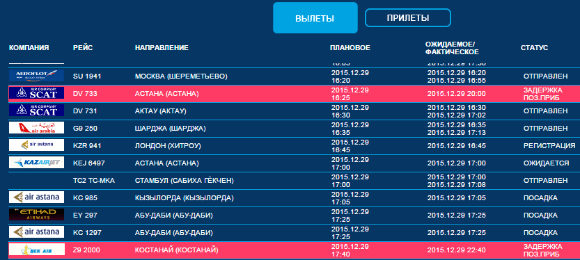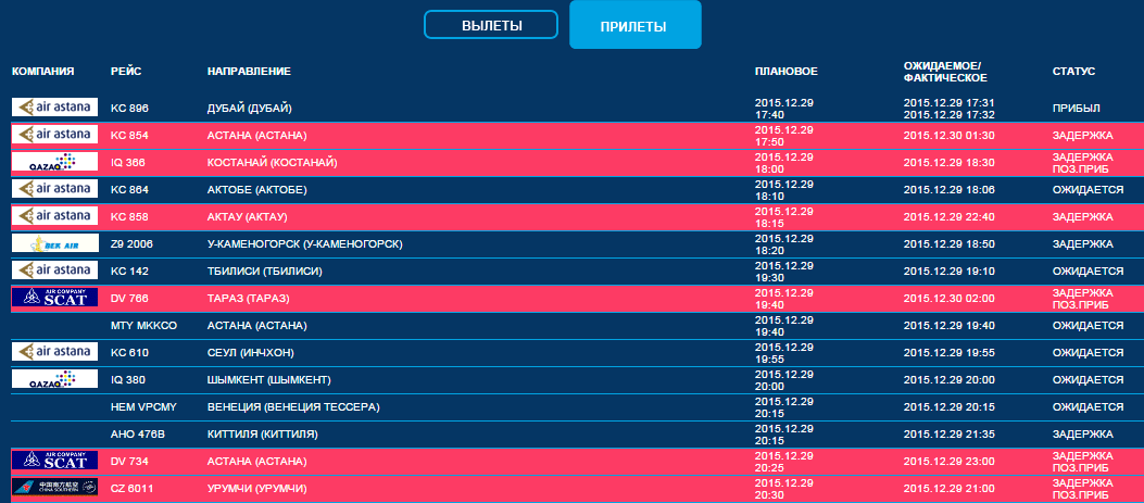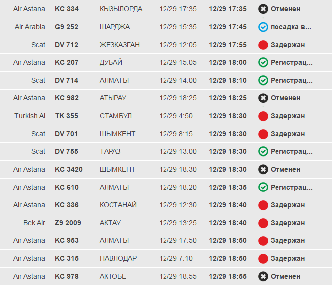 В международном аэропорту Алматы задерживается вылет двух внутренних рейсов и прибытие шести рейсов.